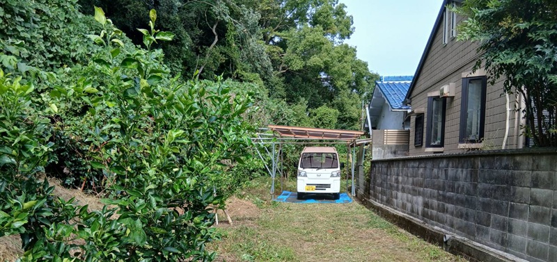 ミカン畑の端っこへ即席ガレージ建てました
