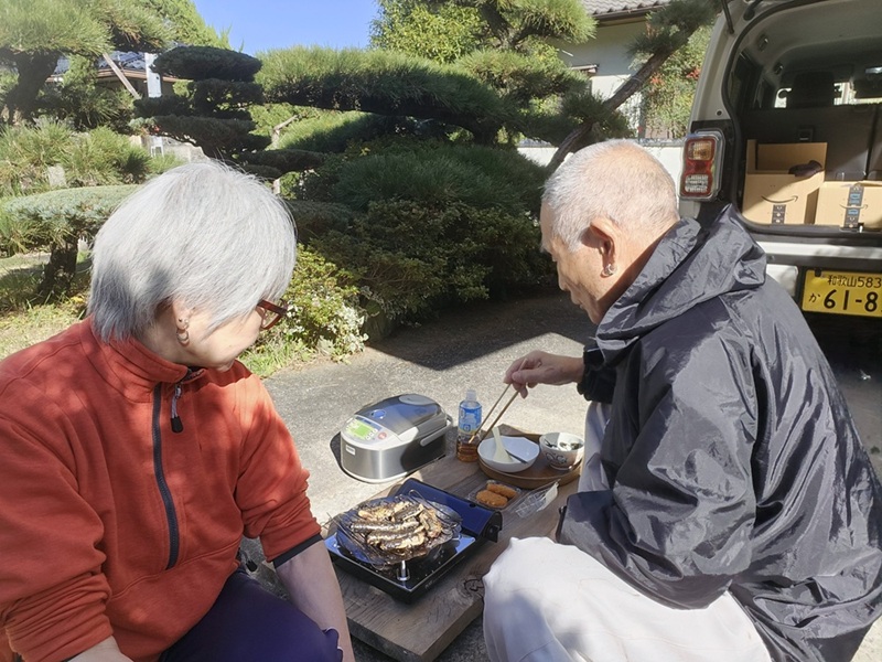 出かける前に、じじいんちの庭ででサンマ焼いて腹ごしらえです